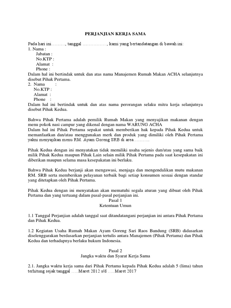Jika anda merasa cocok dengan tawaran kerjasama tersebut, maka anda bisa membalasnya dan menanyakan lebih detail mengenai. Surat perjanjian usaha modal bersama. Tidak menjalankan bisnis usaha yang serupa dilakukan oleh pihak kedua tips menuju sukses selama 40 hari berhak membatalkan perjanjian dan/atau mengambil kembali sebagian modal usaha dari pihak kedua ala. Pihak pertama atas nama i*hael +l,in utiyono selaku pemilik dan pihak kedua menerima barang. Anda bisa menemukan contoh surat perjanjian kerjasama beserta strukturnya dengan mudah di internet.